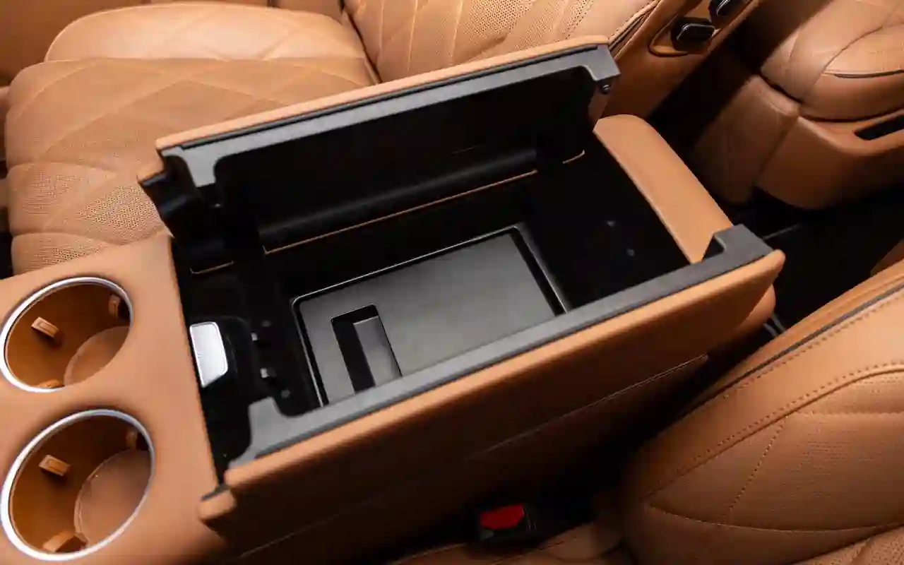 К слову, есть холодильник и портативная «микроволновка». Конечно, шутим, но отчасти. Вместительный отсек под подлокотником водителя не только охлаждает, но и греет: саке или шампанское для вип-пассажира всегда будет правильной кондиции.
